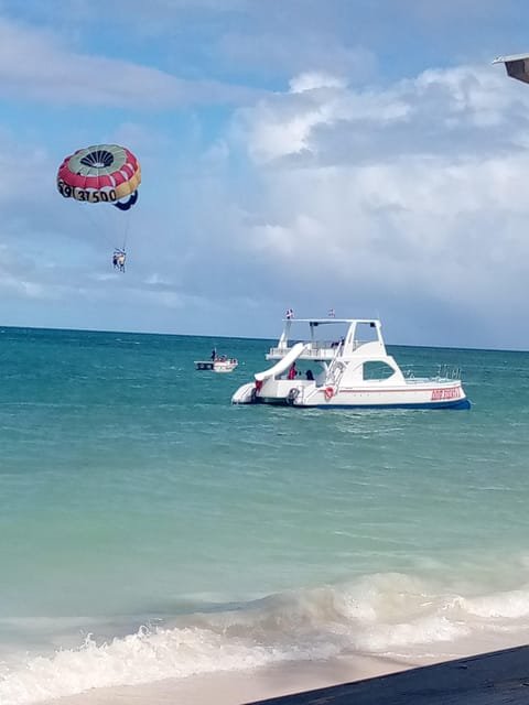 Party Boat we offer transportation to pick you up at your local Airbnb or Resort Once at the meaning point we will transport you on a charter boat to the party boat. From the starting location you will see local resorts and world-renowned beaches. Your first stop will be snorkeling where you will be with an official licensed lifeguard who will be in the water with you showing you the location of live weeks and also marine life. After 45 to 1 hour in the water snorkeling and jumping off the party boat water slide, you will go to the next location which is Dolphin Island.