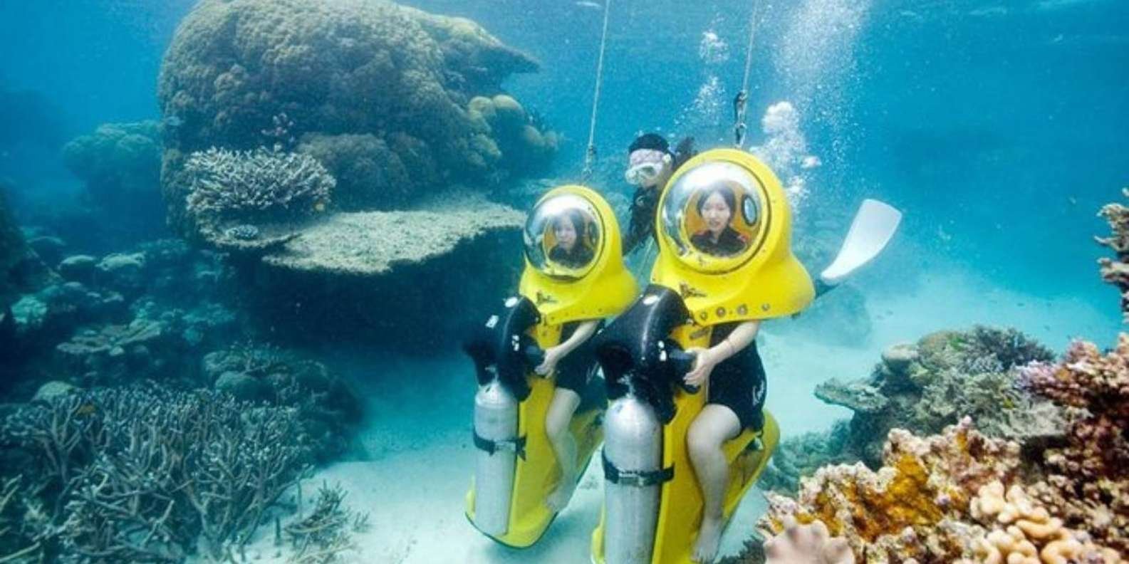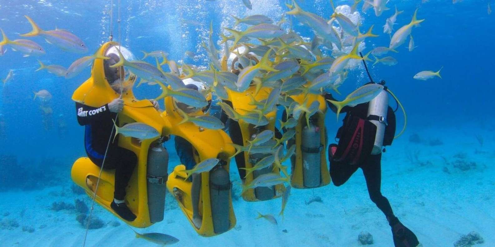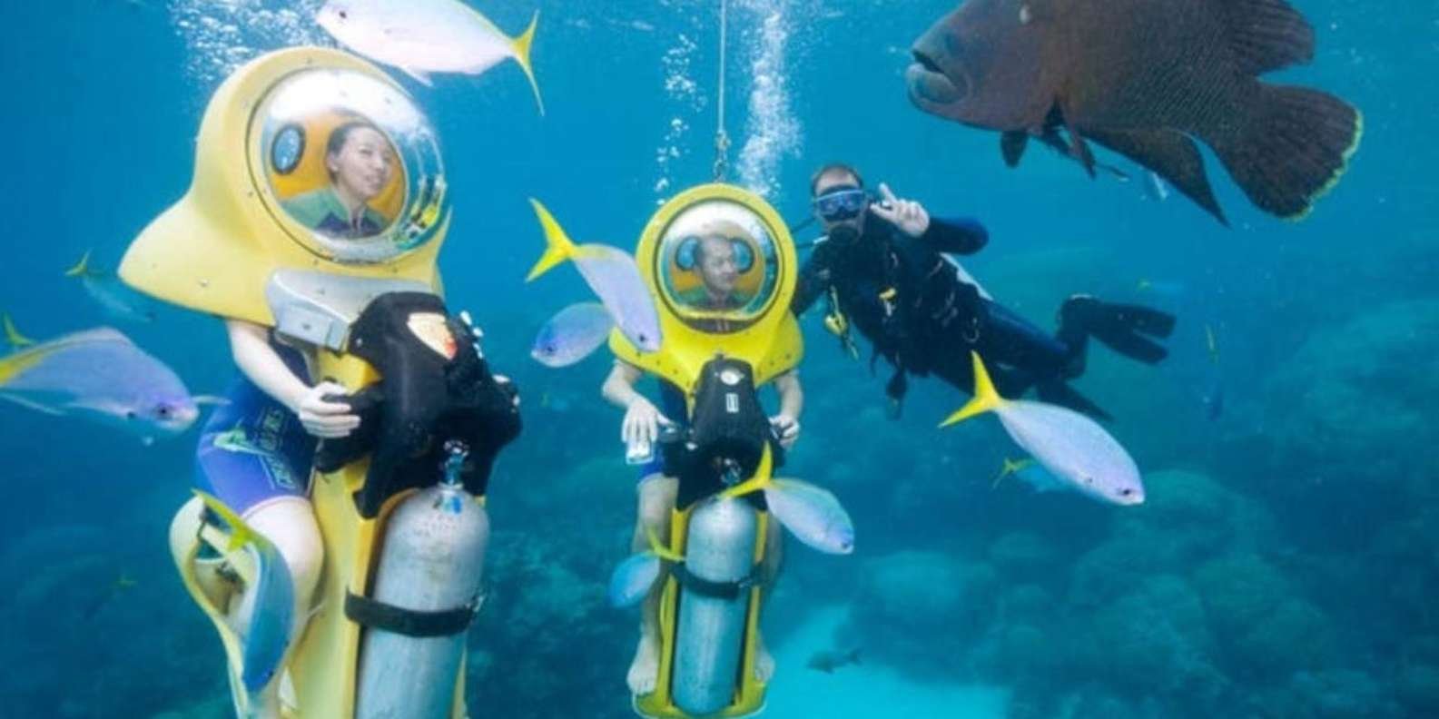 Be picked up from your hotel and head to the beautiful coast of Cabeza de Toro in Punta Cana. Board a boat that will take you to a comfortable platform where you will be received by specialized personnel. With your Dive Master guide, carry out an underwater adventure comfortably seated on an Underwater Scooter without using a mask or tube, and breathe normally at a depth of 3 to 5 meters.